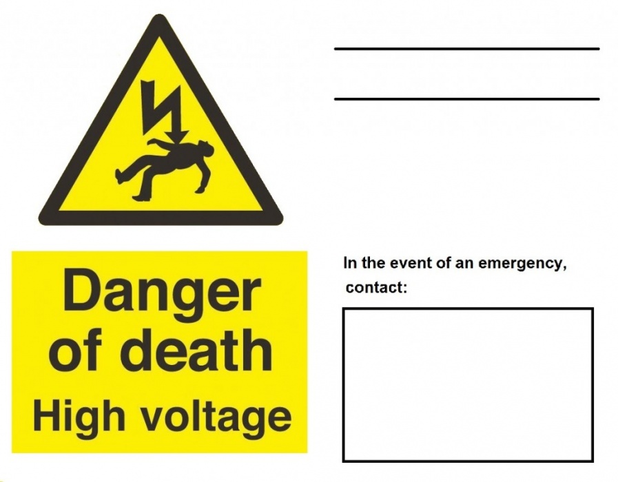 White and yellow hazard sign with yellow triangle advising of Danger of Death, High Voltage with line for emergency contact.