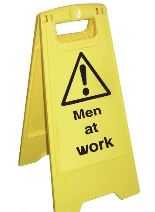 Bright yellow fold flat cleaning stand reading – Men at work, with hazard symbol.