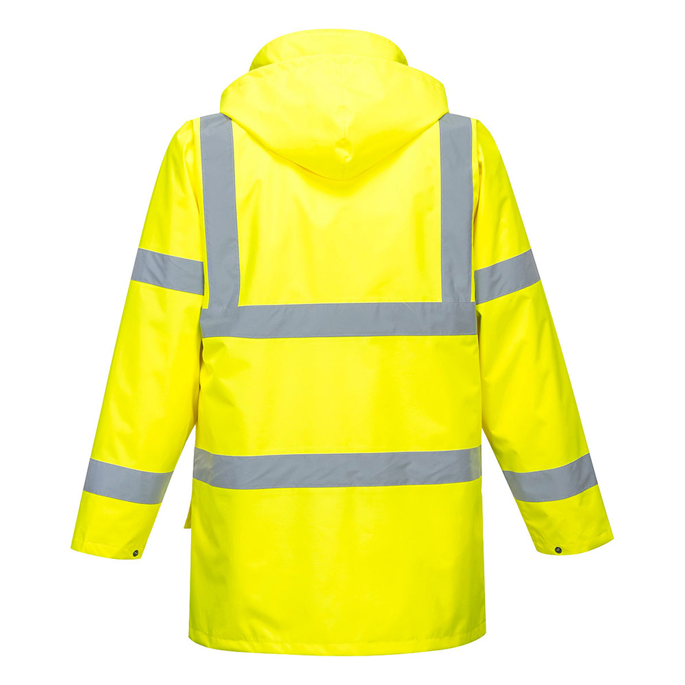 Waterproof with taped seams preventing water penetration│ Extremely water resistant fabric finish, water beads away from fabric surface│ 6 pockets for ample storage│ Dual ID holder allows use of both portrait and landscape ID card display│ Stud adjustable cuffs for a secure fit │ Detachable inner jacket for added versatility in all weather conditions│ Jacket can be worn five ways for multi use │ Reflective tape for increased visibility │ Concealed mobile phone pocket│ Two-way zip for quick and easy access │ Pack away hood for added functionality │ 40+ UPF rated fabric to block 98% of UV rays │ Certified to EN ISO 20471 after 50x washes│ Radio loop for easy clipping of a radio │ Interactive inner garment │ CE certified